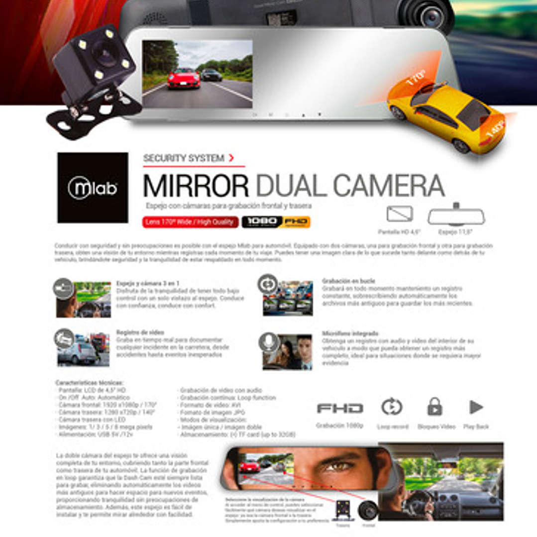 Espejo Retrovisor Cámara Frontal + Retroceso Full Mlab 9320